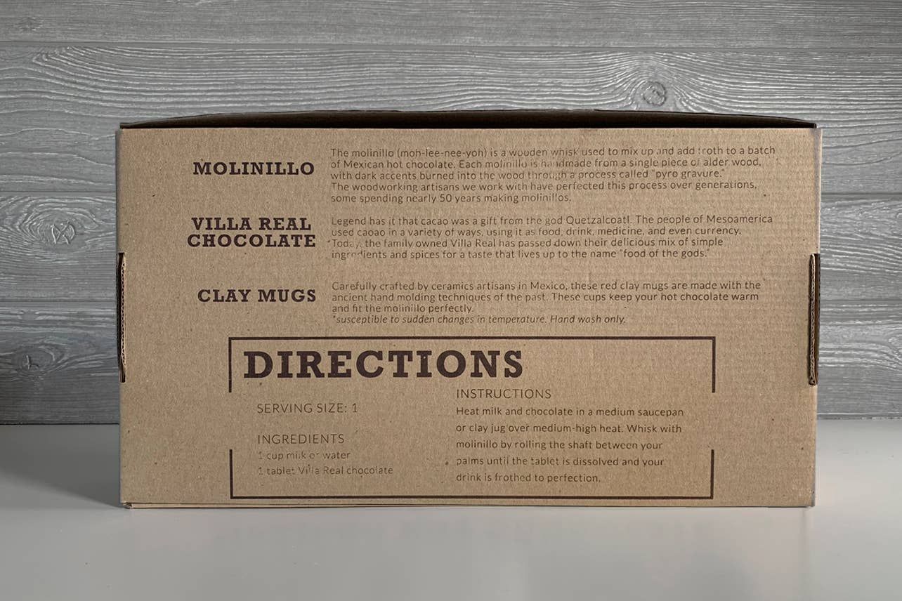 What's included: Villa Real Mexican Hot Chocolate with Almonds: Set of 2 Clay Mugs Small Traditional Molinillo Whisk *Lead Free Size of gift box: 16 x 9 x 4''